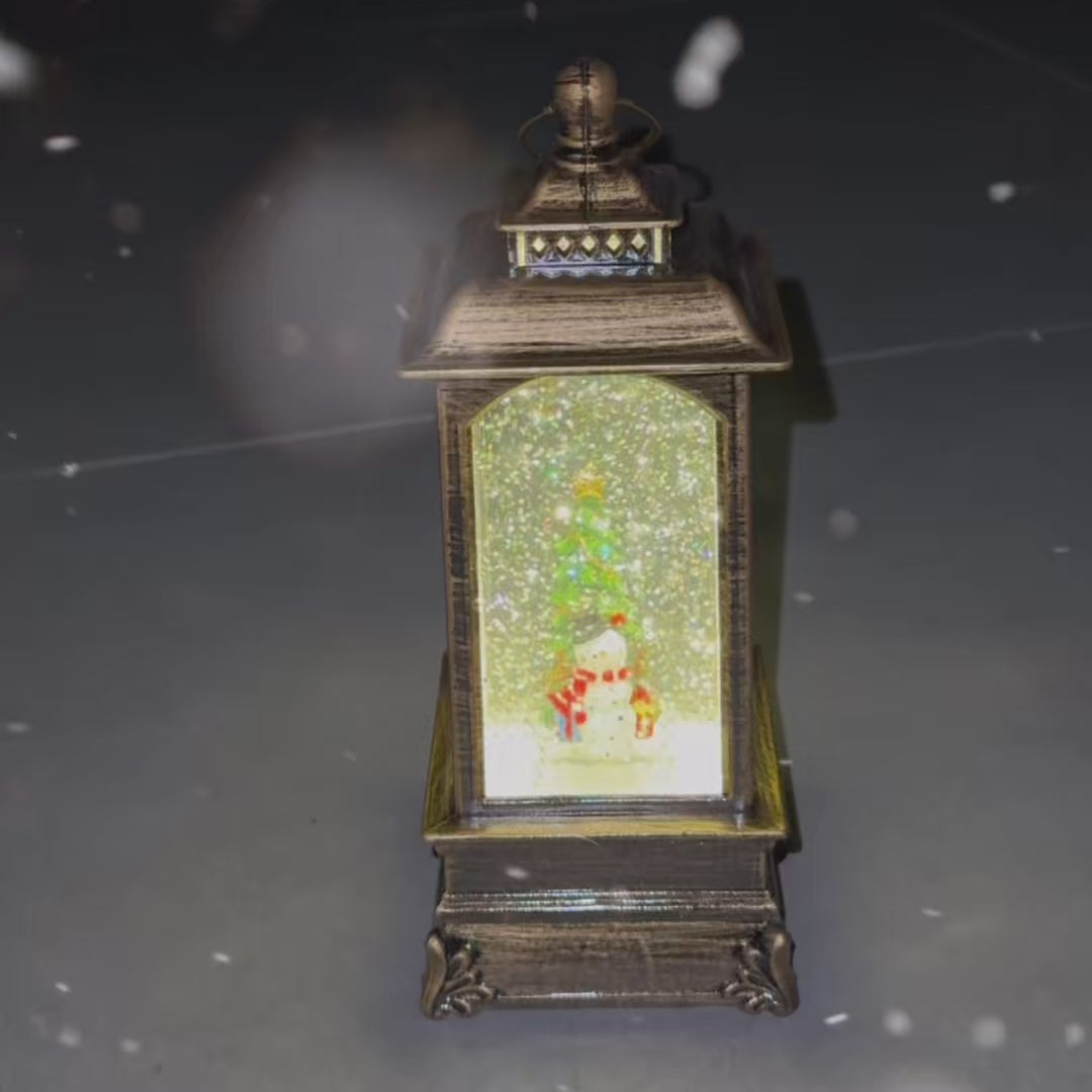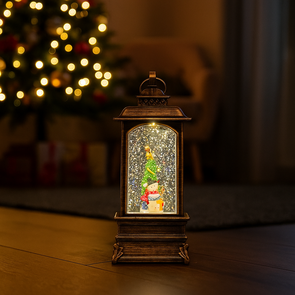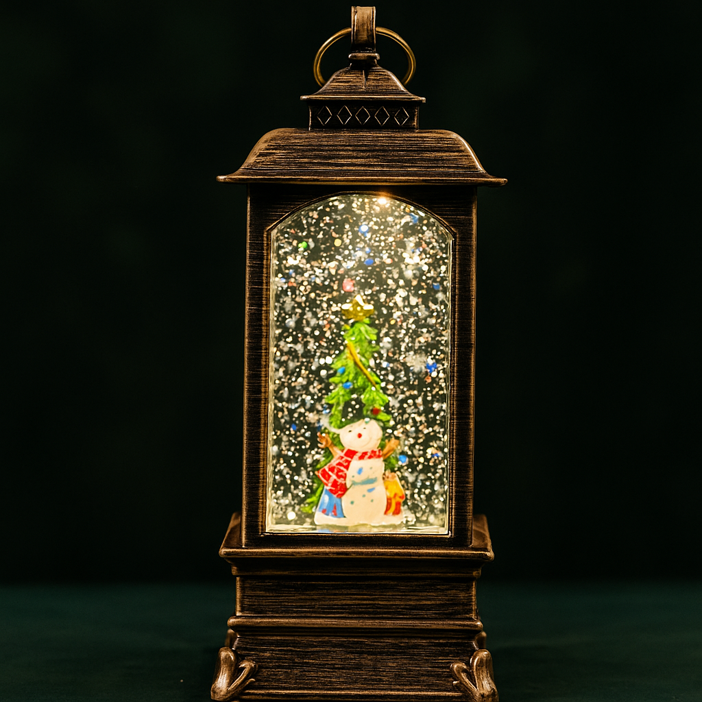 Внеси топлина и коледен уют у дома с тази изключителна декоративна лампа, която ще се превърне в акцента на празничната ти декорация. Вътре в елегантния фенер се крие малък свят – усмихнат снежен човек, искряща елха и бляскав “сняг”, който се завихря като истинска зимна приказка.